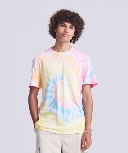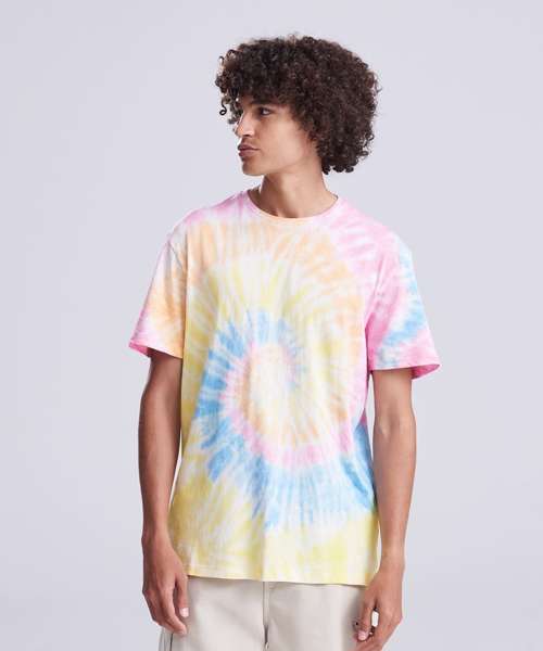 Modern fit with side seams. Short sleeves. Tie-dye design. Every piece is unique. Size label only, for easy rebranding – colour-coded black for unisex. Combed ringspun cotton for ultra comfort. Surface excellent for print or embroidery. Taped neck. Ribbed crew neck style. Twin-needle stitching detail on sleeve and bottom hem.